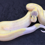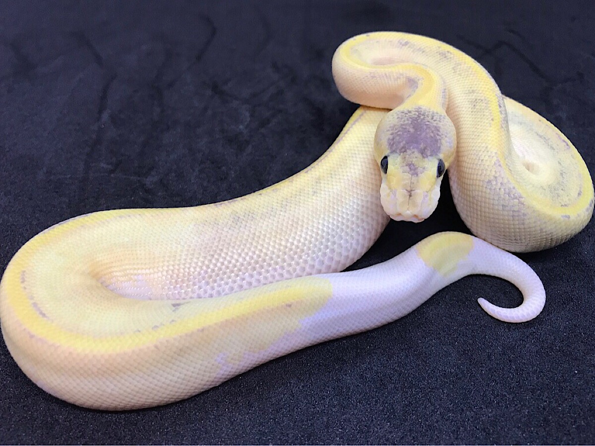 Firefly Mojave Champagne, it is very yellow (pastel influence) towards the tail yellow brightens up, ringer tail and red pupils (fire influence) slight tint of purple on head stamp and purple outline on dorsal stripe (Mojave influence) and champagne is quite apparent. From a Firefly Mojave to Champagne breeding.